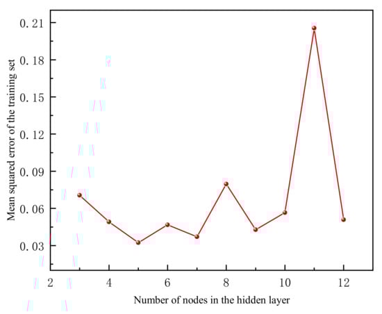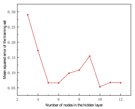 A three-layer grid was used to establish the SSA-BPNN model. Based on the input and output of the model, the number of nodes in the input and output layers were determined as 5 and 1. In addition, the number of nodes in the hidden layer was obtained based on the MSE of the training set. By setting the number of nodes from 3 to 15, the MSE of the training set was obtained, as shown in Figure 6. It can be seen that the MSE was the smallest when the number of nodes was 5. Therefore, the grid structure of the SSA-BPNN model was chosen as , as shown in Figure 7.