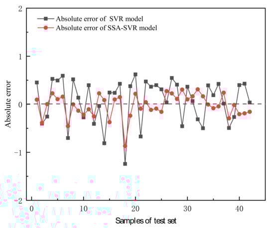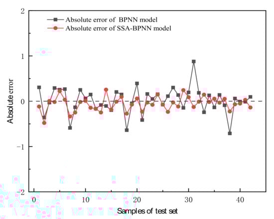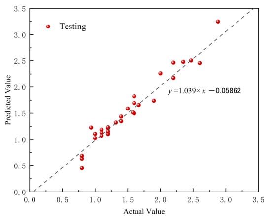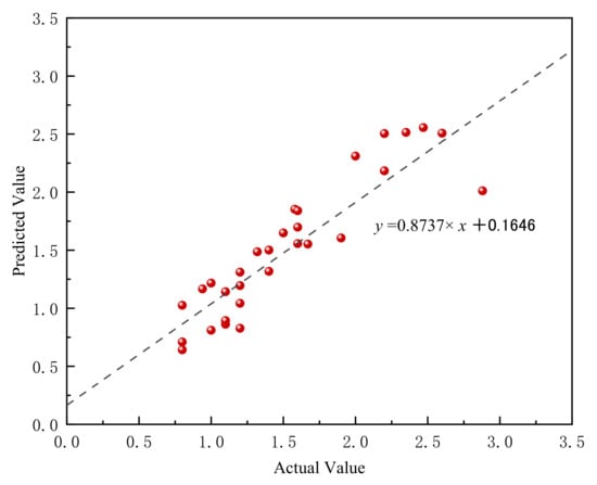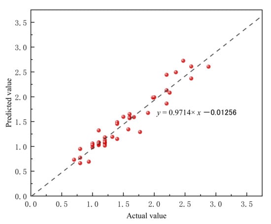 After the model was trained based on the training set, the test set was used to evaluate the predictive performance of the SSA-BPNN model. The relationship between the actual and predicted values is shown in Figure 8. It can be seen that their values had a good correlation.