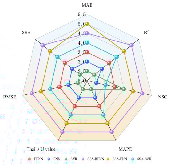 The structure of the proposed methodology is shown in Figure 4. Firstly, the original data were randomly divided into a training set (80%) and test set (20%). Secondly, the SSA was used to optimize the parameters of the BPNN, ENN and SVR models. Thirdly, the training set was adopted to train the optimized model. Fourthly, the test set was employed to analyze the accuracy of each model, and seven indexes, including the mean absolute error (MAE), coefficient of determination (R2), Nash–Sutcliffe efficiency coefficient (NSC), mean absolute percentage error (MAPE), Theil’s U value, root-mean-square error (RMSE), and the sum of squares error (SSE), were used to evaluate each model’s performance. Finally, the optimal model was determined based on their comprehensive performance. The whole process was implemented in the MATLAB software. This section introduces the principles of the different models and the performance-evaluation indexes in detail.