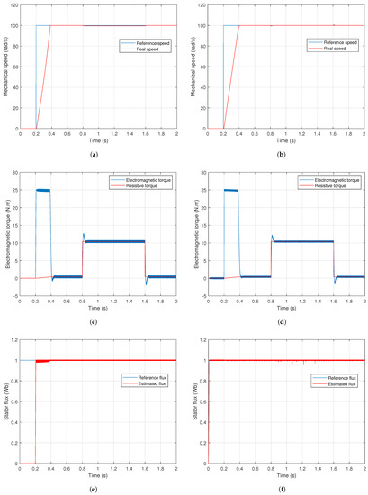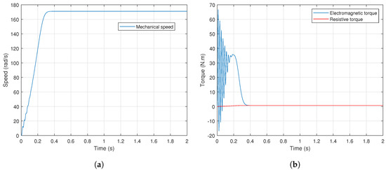 The test in Figure 8 presents the start-up of the induction motor according to a speed step of 100 rad/s. Then, a load of 10 N·m was applied at = 0.8 s and removed at = 1.6 s.
