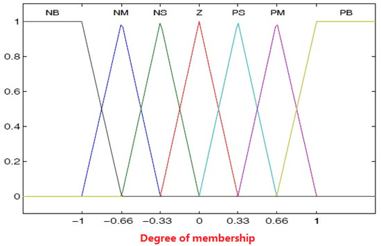 The input variables are converted into fuzzy ones and are translated into linguistic labels. The membership functions linked to each label are chosen in triangular forms. The input and the controlled output linguistic variables’ fuzzification is achieved by symmetric triangular membership functions on a universe of speech normalized on the interval [−1,+1] for each variable, as shown in Figure 4.
