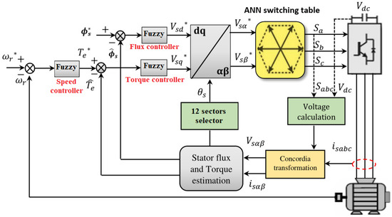 The diagram of torque and flux control is based on the proposed twelve-sector DTC with the ANN algorithm and is presented in Figure 7.