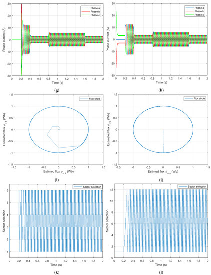 The stator flux evolution, such as its magnitude and circular trajectory, can also be observed in the simulation results. For example, according to the stator flux magnitude, the ripples exceeded the hysteresis bounds, which can be seen in Figure 8i. Moreover, due to the changing of the zone, the flux initially took a few steps before achieving the reference flux magnitude (1 Wb) (Figure 8k). Furthermore, the stator flux components showed an acceptable waveform, but a high level of ripples. The proposed ANN-DTC showed a reduced level of flux harmonics, quicker magnitude tracking at the initial state, and a better component curve than the classical DTC. This was due to the better zone selection operation of the stator flux vector in the proposed technique. The zone selection operation can be seen in Figure 8l.