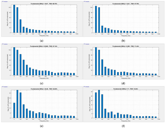 THD improvement of electromagnetic torque, stator flux linkage, and stator phase current. (a) Basic DTC: electromagnetic torque THD, (b) proposed DTC: electromagnetic torque THD, (c) basic DTC: flux of stator THD, (d) proposed DTC: flux of stator THD, (e) basic DTC: phase current THD, and (f) proposed DTC: phase current THD.