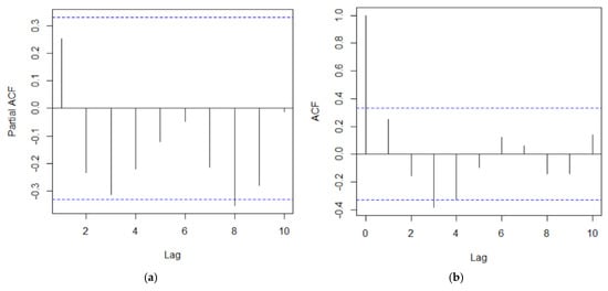 The stationarity assumption of is tested first. The test is carried out using the Augmented Dickey–Fuller (ADF) test. Briefly, with a significance level of 0.05, the test statistic value of , −3.4135, is greater than the critical value, −3.5560. Therefore, is not stationary, so is differentiated. differentiation is performed so that is obtained. Briefly, the new test statistic value of , −3.9161, is smaller than the critical value, −3.4135. Therefore, is stationary. The next step is to determine the autoregressive order and the moving-average order . The order and are determined using the partial autocorrelation function (PACF) and autocorrelation function (ACF) diagrams. Lags cut off from the PACF and ACF diagrams are selected as autoregressive order and moving-average order, respectively. In this study, the maximum lag considered is ten. The PACF and ACF diagrams from lag one to lag ten are presented in Figure 1.