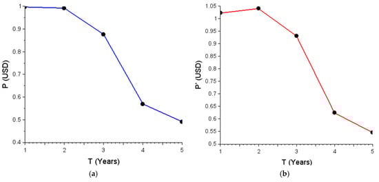 where represents the coupon, and represents the first time one of the threshold values of the aggregate of actual losses and fatalities occurred. The principal structure on the maturity date () is the same as shown in Equation (13). The coupon-paying MTCB pricing model is designed as the sum of the present value of the expectations in each year in MTCB’s life span and the present value of the expectation on the maturity date. Mathematically, the coupon-paying MTCB price () is expressed as follows: