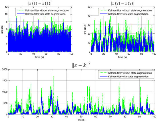 Comparison of estimation errors between SKF and improved KF using state augmentation.