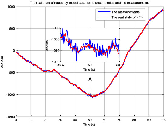 Assume that the statistical property of is known, if the relationships between the modelling errors and matrices A, B, and C are simple, and can be solved by direct algebraic operations. Otherwise, and are calculated by stochastic simulations [36]. For example, according to the statistical property of , 10,000 realizations of and by stochastic simulations are constructed, then the and can be calculated by averaging. In contrast, if the statistical property of is not known, and can also be calculated according to plenty of realizations of matrices A, B, and C obtained during the modelling process. According to the above analysis, it can be obtained that and can be calculated offline, which means that the filter proposed in this study may be more conducive to implementation and application than those in [8,24,34].