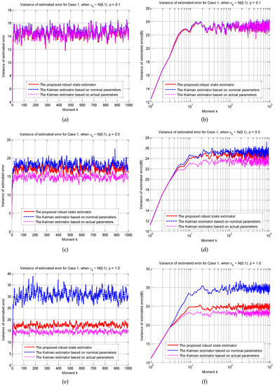 Through a comparative approach, random simulations have been performed to demonstrate the effectiveness of the proposed estimator. Each simulation generates 1000 time-domain input/output data pairs for the state estimation of the plant, in which all initial states are set to 0, and the disturbances and are produced following normal distributions. The ensemble-average estimated error variance of these random simulations at each sampling time is calculated as follows: