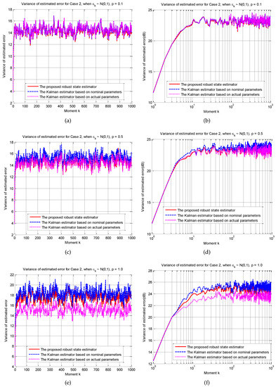 Next, the simulation is divided into two cases: Case 1. In these simulations, the modelling errors follow a normal distribution(). However, in the same simulation, at each moment does not change. Case 2. In the same simulation, the modelling errors at each moment follow a normal distribution(). For the two cases mentioned above, three sets of experiments are made. The differences among these three sets of experiments are the change of p. The purpose is to change the “size” of uncertainty. is in the first group, , and are in the second and third group, respectively.