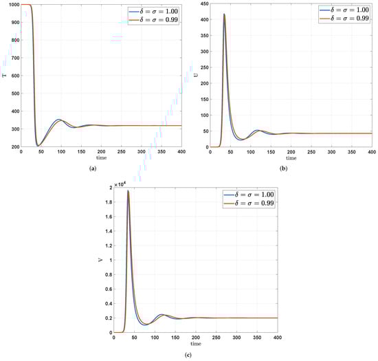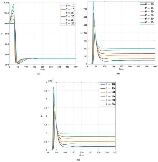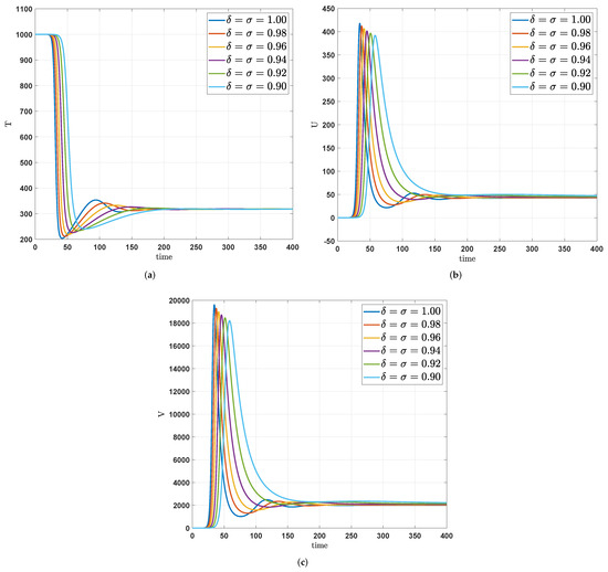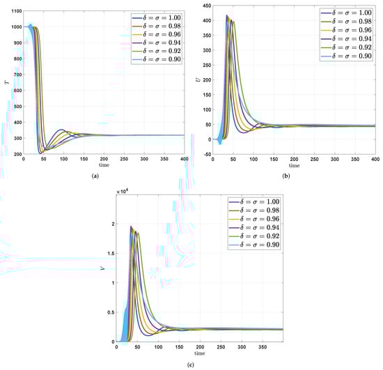 In Figure 6, based on the Adams-Bashforth method, we see the numerical trajectories by varying the supply rate for new T-cells for under the fractal order and fractional order . Thus, in Figure 6a, it shows that the susceptible T-cells increase for a period of time and gradually decrease as the number of the supply rate increases before converging at the 150th day.