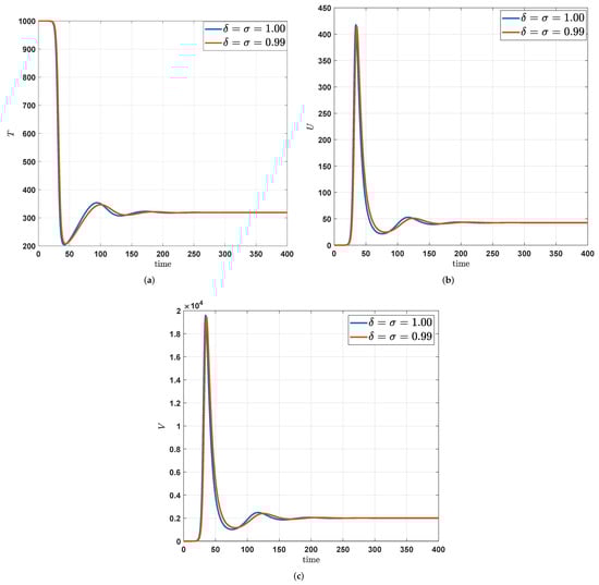 In Figure 2a,c, we show a -variation in fractal-fractional order. In this case, the numerical trajectories show that a slight change in the fractal-fractional order produces a slight changes in the asymptotic behavior of the HIV-1 virus on T-cells.