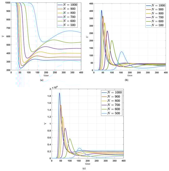 In Figure 5, based on the Adams-Bashforth method, we see the numerical trajectories of three state functions by varying the average number of infected particles N for the values under the fractal-fractional order . Thus, in Figure 5a, it shows that the susceptible T-cells increase as the average number of infected particles by an existing infected cell reduces by , and that of the peak of the amount of infectious T-cells and the free particles of the infection of the HIV-1 virus in the blood decrease, respectively in Figure 5b,c.