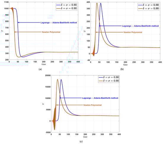 In Figure 6b,c, we noticed that the amount of infectious T-cells and the free particles of the infection of the HIV-1 virus in the blood increase, respectively. Figure 7a–c display the numerical trajectories when we compare the numerical solutions of the Adams-Bashforth method with the Newton polynomial method under the fractal dimension and fractional order .