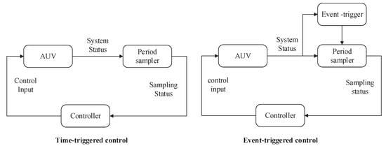 From these studies, we can find that most researchers focus on the study of HOAUVs, and there are fewer research results involving the control strategy of HEAUVs. In designing the event triggering control strategy, it is necessary to ensure that the interval between any two consecutive event triggering moments is greater than zero, to avoid the occurrence of the zeno phenomenon, which refers to a system with numerous triggers in a finite period of time. How to effectively avoid this phenomenon is key in event triggering control. The periodic event triggering strategy can be a good solution to this problem []. Unlike the trigger control in the above literature, the periodic event triggering strategy combines the time triggering strategy and the event triggering strategy. The strategy judges the event triggering conditions at the sampling moment, thus further saving the computational resources. Since the event triggering moments all occur at the sampling moment, the minimum event triggering interval is a fixed period. The difference between event-triggered and time-triggered is illustrated in Figure 1.