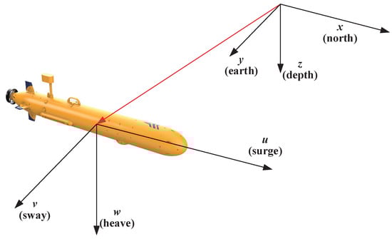 For the convenience of problem research, this article assumes that the AUV is fully driven; each AUV can detect its position and angle information, and can receive the status information of the neighbor AUV. To describe the motion state of the AUV, an inertial coordinate system I and a motion coordinate system B are established, respectively. The AUV model is established as shown in Figure 2.