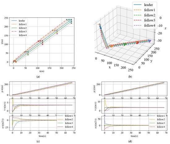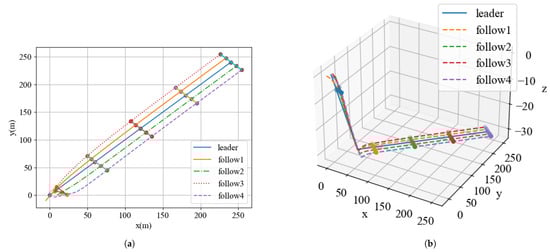 The simulation results are shown in Figure 3. From Figure 3a,b, it can be observed that the formation process of the AUV swarm and the state of the formation keep their navigation. From Figure 3b, it can be observed that the followers in the AUV swarm are able to keep the desired relative distance motion with the navigator. From Figure 3c–e, it can be observed that the velocity of the followers is able to reach the same speed as that of the navigator. The acceleration of the follower eventually converges to zero. The event trigger moments are shown in Figure 3f. It can be observed that the proposed control mechanism can significantly reduce the number of communications. In realistic applications, we can select four or more AUVs of equal size and type as test objects. The control center is deployed on the shore, and control commands are sent to each AUV according to a fixed period. According to the motion data returned by the AUV, the consistency control algorithm is used to adjust the control instructions to realize the consistency control of HOAUVs. Moreover, in the actual underwater communication environment, we can take the time delay into account. In the original control strategy, we introduce a fixed time delay, and its formation change is shown in Figure 4a,b. It can be observed from the figure that when there is a time delay, the original control strategy obviously cannot guarantee that the state of HOAUVs reaches the same state in a limited time. Therefore, we need to improve the control strategy, which is also the direction for further research in this paper.