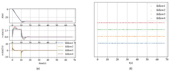 The formation process of HEAUVs can be observed in Figure 5a,b. The position and velocity of the follower can reach the leader, and the acceleration of the follower eventually converges to zero, as shown in Figure 5c–e. The event trigger moments are shown in Figure 5f. As can be observed from the figure, in the distributed event-triggered control algorithm proposed in this paper, each follower AUV only updates the control signal at the trigger time of its event, without considering the trigger time of its neighbor nodes, which can effectively reduce a large number of redundant AUVs. This can reduce the update frequency of the control signal of the system. Moreover, the estimation-based triggering condition is adopted, which can effectively prolong the release time of event triggering and reduce the number of event triggering controls. The convergence of the final speed and position state is better, and the consistency can be obtained faster.