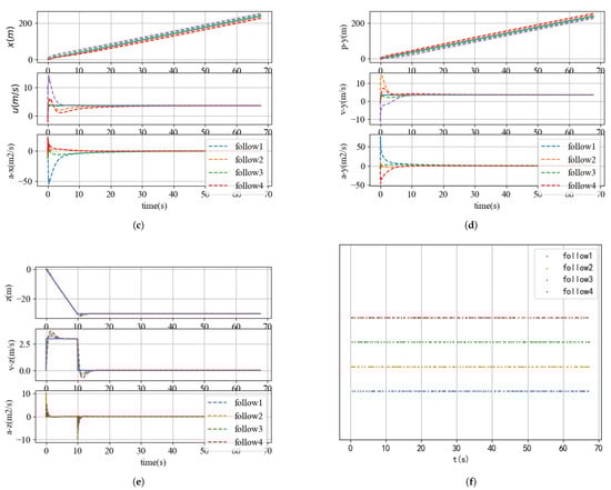 (a) HOAUVs’ formation (2-D); (b) HOAUVs’ formation (3-D); (c) state in x-direction (HOAUVs); (d) state in y-direction (HOAUVs); (e) state in z-direction (HOAUVs); (f) event trigger time (HOAUVs).