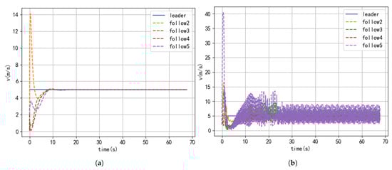 (a) Velocity in x-y direction (HEAUVs with event-triggered); (b) velocity in x-y direction (HEAUVs with time-triggered).