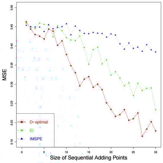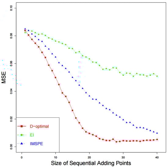 where, , , , . The best value of the calibration parameter is . Assume that the expectation of is , and the correlation function of is Gaussian. The expectation of is set to be zero, and the correlation function of is also assumed to be Gaussian. Let the prior for , , and be , , and , respectively. A total of 500 simulations are performed to assess the performances of the sequential designs. A design with 10 points are employed for physical experiments, and a MmLHD with points over is utilized as the initial design for computer experiments. In this case, the number of sequential points is set to be . The results of are drawn in Figure 5. As the size of sequential experiment points increases, the calibration parameter approaches the best value. The proposed method has smaller MSEs than the other two methods, which means the proposed method performs better. Figure 6 shows the results of , which also demonstrate the effectiveness of the proposed design for calibration.