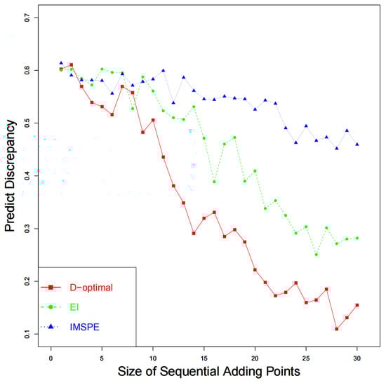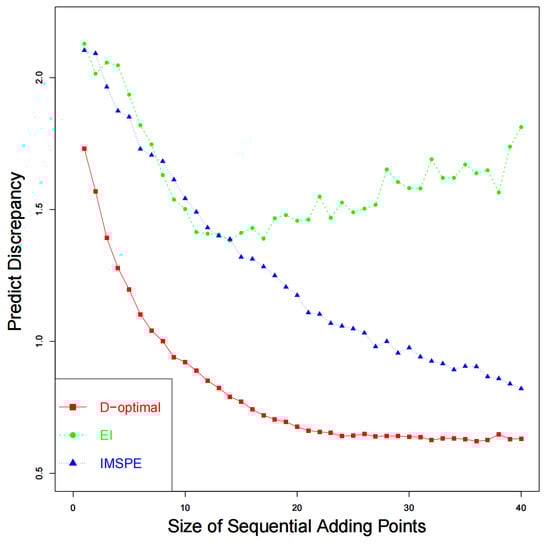 From Figure 6, we can easily find out that when 20 points are sequentially added, the discrepancy tends to be stable. As shown in Figure 7, the physical prediction combining discrepancy and calibrated computer model by utilizing the proposed sequential D-optimal method is the closest to the physical observations, followed by the IMSPE method and EI method. The results regarding the MSPE are presented in Table 2, which shares similar conclusions as those in the case study I.