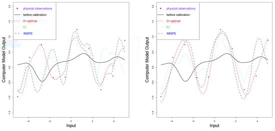 where denotes the corresponding Euclidean distance. Ref. [] proved that under certain conditions, the Kennedy–O’Hagan calibration estimator converges to the minimizer of the norm of the residual function in the reproducing kernel Hilbert space. As a result, we assume that is the best value of calibration parameter. For more details about the reproducing kernel Hilbert space , please refer to [,]. is the estimate of the calibration parameters at the th replication after l sequential design points, and M is the number of the simulation replications. The MPD is considered to assess the predictive performance of the calibrated computer models, which defined as