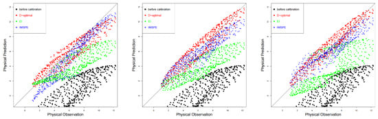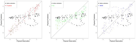 Physical predictions before and after calibration using the D-optimal method, EI method, and IMSPE method. The left, middle, and right panels show the results of sequentially adding 20, 25, and 40 points, respectively.