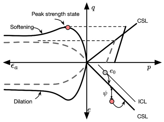 The stress–dilatancy relation plays a crucial role in developing critical state models since dilatancy is an essential factor in characterizing both strength and deformation of soils. One of the distinct features of over-consolidated clay is that the dilatancy closely depends on the degree of over-consolidation [2,3,4]. The modified Cam-clay (MCC) model will underestimate the volume expansion of heavily over-consolidated clays under the drained compression condition because its stress–dilatancy relation only depends on the stress ratio [5]. To overcome this limitation, Yin and Chang [6] developed an empirical stress–dilatancy relation in terms of e/ecs to account for the effect of over-consolidation ratio (OCR) on the dilatancy of clay, where e and ecs are the current and the critical state void ratios at the same stress level, respectively. Similarly, the state parameter proposed by Been and Jefferies [7], which can be denoted as ψ = e − ecs, can also be used to capture the dilative response of an over-consolidated clay [8,9,10]. The formulas of those stress–dilatancy relations are quite different from that of the MCC model, which may have some difficulties in developing a practical model for the over-consolidated clay. To simplify the procedure, Gao et al. [11] extended the stress–dilatancy relation of the MCC model by introducing a new parameter to quantify the degree of over-consolidation, which was defined as the ratio between the distances of the current and image stress points from the mapping center. The new relation can be used in either the bounding surface or the sub-loading surface models for over-consolidated clay.