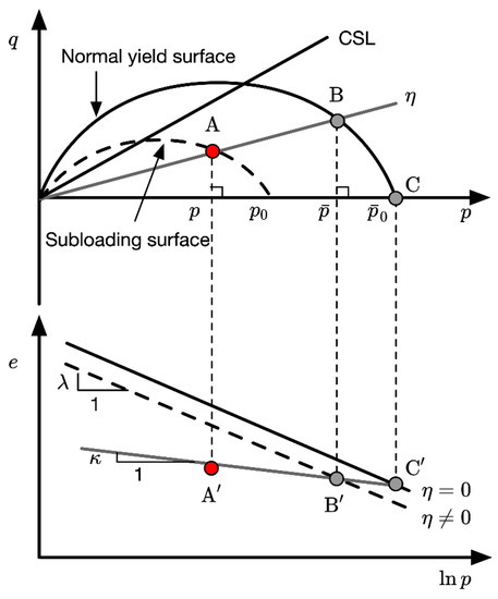 Unlike normally consolidated clay, the initial stress state of over-consolidated clay before shearing is located inside the normal yield surface due to the loading history. It may pass through the critical state line and move backward before the current stress state reaches the yield surface, following a specific stress path (i.e., = 3 for a drained triaxial test). Thus, the stress–strain relation of over-consolidated clay exhibits softening behavior during the post-peak strength loading process, accompanied by dilative volumetric deformation. Note that plastic deformation always occurs in the soil even an infinitesimal loading is applied. This suggests that the current stress point remains on a sub-loading surface, and the soil sample is yielded during the loading process. As illustrated in Figure 3, in the p–q plane, the current stress state A (p,q) (i.e., the red circles) and the reference stress state B (p,q) (i.e., the grey circles) are located on the sub-loading surface and the normal yield surface, respectively. We can use the similarity ratio R to determine the current size of the sub-loading surface to that of the yield surface. R is the inverse of the over-consolidation ratio OCR and is defined as . For normally consolidated clay, the sub-loading surface coincides with the normal yield surface as R = 1. On the other hand, R is less than 1.0 when the soil is over-consolidated, and the sub-loading surface is located inside the normal yield surface.