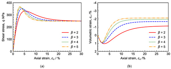 Figure 5 shows the influence of parameter β on the stress–strain relation and volumetric deformation for over-consolidated clay in a drained triaxial test. The relationship between the mean effective stress increment and deviatoric stress increment is given as = 3 . It can be found that the tangent modulus is increased with increasing β value, and the soil becomes stiffer, resulting in a higher peak strength. Meanwhile, the soil experiences expansive volumetric deformation after compaction, and the final dilation is also increased with a larger β value.