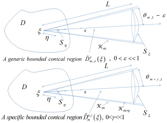 The aim of this section is the application of the aforementioned stochastic algorithm to the reconstruction of the scatterer on the basis of exploiting data offered on a spherical surface which might coincide with or be broader than the circumscribing sphere of the scatterer. The concept is to take advantage of the data provided on and reconstruct suitably the scattered field inside the ball confined by and hosting the scatterer. In fact, the portion of the spherical surface , whose information is instantly utilized, constitutes the base of a cone , whose vertex is orientated inside the ball and consists in one of the domains—frequently encountered in this work—of the stochastic experiments. The broadness of the cone depends on its pervasiveness inside the ball . The narrower the cone, the larger its potential maximal height and consequently its depth inside the matrix enclosing the scatterer. There is an intrinsic behavior reminiscent of the uncertainty principle between the width and height of the emerged cones. All this description refers to the parameters and that are oppositely monotone with respect to the integer m, nominating the class of every particular cone. To clarify theses remarks, let us refer for simplicity to a particular case, where the sphere is centered at the coordinate origin, has radius and surrounds a scatterer with surface , as depicted in Figure 11.