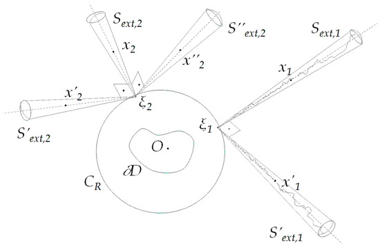 Every such point constitutes the vertex of a cone whose base is the sub-surface . These cones do not have—in their majority—upper spherical cups orientated with their axis , but this geometrical slight declination does not affect the probabilistic setting developed so far given that the influence of the bases to the evolution of the trajectories applies only to the final steps of their travel. In summary, if only are to be determined (for a plethora of points , on ), then the information on is enough. Moreover, if we are interested in determining the vectors themselves, we evoke the dual perpendicular cones (as demonstrated in Figure 7) whose base assembly forms a supplementary far field data region of indispensable utility.
