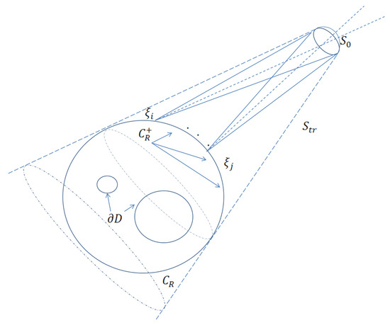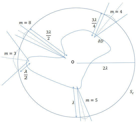 where we recognize the far field pattern, or, alternatively stated, scattering amplitude , totally characterizing the behavior of the wave field several wave-lengths away from the scatterer D. Actually, Equation (4) offers the first term of the asymptotic expansion of via the famous Atkinson–Wilcox expansion theorem [11]. This theorem establishes a recurrence relation between the participants of this expansion. All but the first term are incorporated in the remaining field . A more systematic treatment of this expansion is sometimes needed and the current work offers such an opportunity as the implication of this stuff is needed in Remark 2 of Section 5.