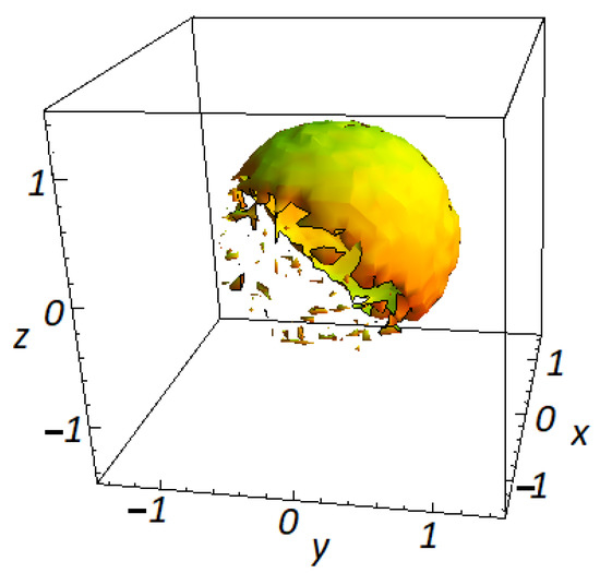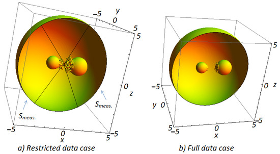 The disconnected case (multiple scattering problem) requires a uniform sampling of vertices , i = 1, 2, …, M inside the orthogonal parallelepiped with axes of lengths along the cartesian axes , respectively, enclosing the scattering objects, in the same manner as in the far field inversion regime encountered in previous section. For the sake of simplicity, we expose just the inversion of two spheres with centers located on the x-axis (positions and ) and radii and , respectively. The synthetic data are produced via the implication of the bispherical coordinate system and the analysis presented in [24] similarly to the treatment implemented in the introductory work [7]. Two separate cases are considered as far as the richness of the data is concerned. In the first case, the data are limited and offered on two spherical portions of the circumscribing sphere, as shown in Figure 13, while the second case refers to complete set of data on . In real situations, the targets are unknown and so the selection of these spherical shells cannot be prescheduled. However, this concrete selection has been adopted intentionally since it represents the less informative scenario (the poorest data pool) given that the gap between the spheres is totally shadowed by the scatterers. The reconstruction in both cases presented in Figure 13 is well indicative as far as the potential of the stochastic inversion is concerned.