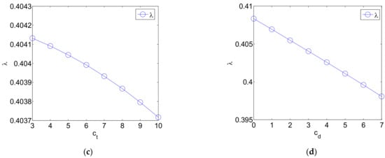 The impacts of system parameter on the take-out platform’s profit . (a) The impact of on the platform’s profit. (b) The impact of on the platform’s profit. (c) The impact of on the platform’s profit. (d) The impact of on the platform’s profit.