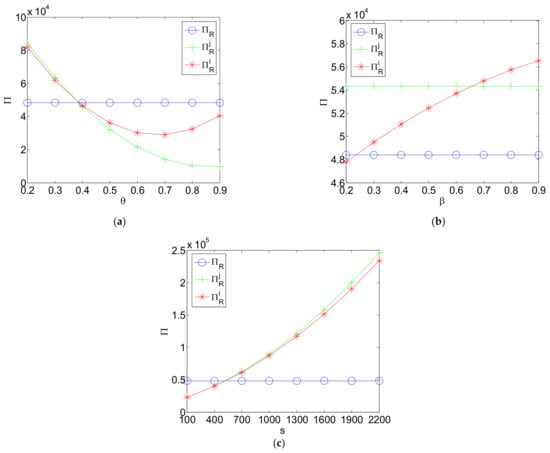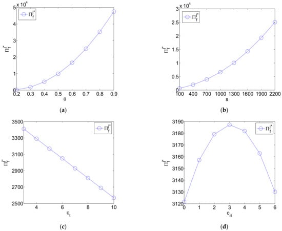 From Figure 3b, we find that when the consumer’s retention rate is higher, the restaurant’s profit under the TOH model is higher than that under the TOF model. Higher consumer retention rate means that when the restaurant leaves the platform to provide take-out service on its own, the loss of demand is not large. Simultaneously, the restaurant does not need to pay any commission. Therefore, under this condition, the TOH model is a better choice.