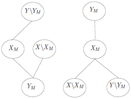 Assume that M is a matching set and (resp. ) be the set of nodes of X (resp. Y) which are incident to the links of M. Therefore, . Keeping in mind that ℵ does not contain links between the nodes of and the nodes of . Otherwise, any such link together with M producing the matching of cardinality more than as that in M, which contradicts the maximality in M.