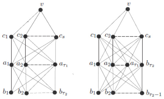 In , without loss of generality suppose that . In case of , we assume that . Let us construct the networks and . The notion Δ represents union between networks whereas denote an empty network with order s and . The notion is any network operation that links entirely nodes in with the nodes which belongs among the partitions of cardinality in (resp. in ). Similarly, an operator represents a network operation which joins entirely nodes in with nodes that belong to in (resp. in ). It can be noted that the operator is expressed only if and .