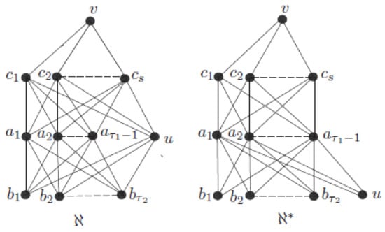 This shows a class of networks such that where , which contradicts the option of ℵ. Hence, this completes the proof of Claim 1.