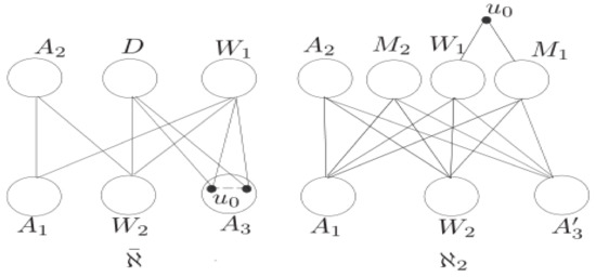 Assume that and are two nontrivial components of having the two partitions and , simultaneously. Suppose that be the two partitions of W which is induced from the bipartition of ℵ. Next, we join entire links among all the nodes of and , and , and we get a network which implies that , . Therefore we suppose that ; see Figure 4.