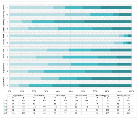 Table 3 summarises all hypotheses about the association between the frequency of the selected activities a week—namely, attending school, commuting, shopping, visiting doctors, attending cultural events, and visiting family—with consumer preferences about shopping in hypermarkets, supermarkets, local stores, alternative shopping methods such as online shopping, or delivery service during the COVID-19 pandemic. As can be seen, Table 3 shows there are 6 statistically significant hypotheses out of 42. In other words, we reject the null hypothesis that there is no significant association between categorical variables. Other hypotheses are not statistically significant based on Pearson’s chi-squared test (p > 0.05).