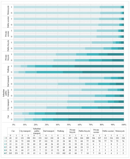 As can be seen, the respondents prefer the car compared to other modes of transport. Of course, these results relate mainly to private vehicles as opposed to shared space. However, many respondents prefer a healthy lifestyle because walking is also the preferred way to move. On the other hand, less than 10 respondents prefer a shared bicycle, a private bicycle, and a shared bicycle. The pandemic affected mobility during the COVID-19 pandemic.