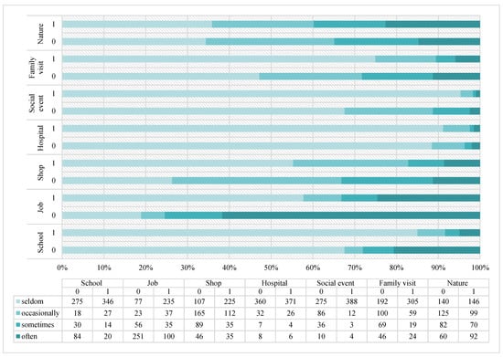 On the other hand, during the COVID-19 pandemic, we expected that there is a statistically significant association between the frequency of school visits per week and consumer preferences for online shopping and delivery services for online education. Second, we assumed that there is a statistically significant association between the frequency of work visits per week and consumer preferences for online shopping and delivery service. Third, we assumed that there is a statistically significant association between the frequency of shopping per week and consumer preferences associated with hypermarkets, online shopping, and delivery service to minimise the spread of the pandemic. Fourth, we expected that there is a statistically significant association between the frequency of hospital visits per week and consumer preferences for restrictions on hospital visits during the COVID-19 pandemic. Fifth, we did not expect a statistically significant association between the frequency of social events per week and consumer preferences during a pandemic, as opposed to a period outside the pandemic or severe constraints. Sixth, we expected a statistically significant association between the frequency of family visits per week and consumer preferences in supermarkets and local shops. We assumed that customers prefer smaller stores with a lower customer incidence. Seventh, we assumed that there is a statistically significant association between the frequency of walking in nature per week and shopping preferences in local shops and supermarkets. We did not assume that the pandemic changes these consumer preferences.