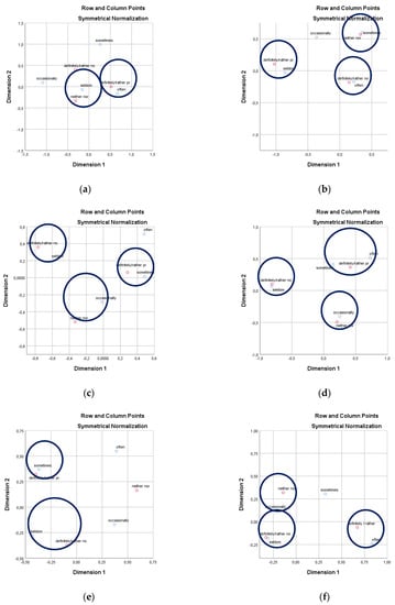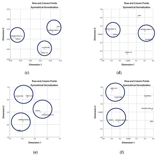 Correspondence maps II: (a) there is an association between the frequency of work visits per week and the consumer’s preference for online shopping during the COVID-19 pandemic; (b) there is an association between the frequency of shopping per week and the consumer’s preference for shopping in the hypermarket during the COVID-19 pandemic; (c) there is an association between the frequency of shopping per week and the consumer’s preference for shopping in the supermarket during the COVID-19 pandemic; (d) there is an association between the frequency of shopping per week and the consumer’s preference for shopping through the delivery service during the COVID-19 pandemic; (e) there is an association between the frequency of family visits per week and the consumer’s preference for shopping in the supermarket during the COVID-19 pandemic; (f) there is an association between the frequency of walking in nature per week and the consumer’s preference for shopping in the local shop during the COVID-19 pandemic.