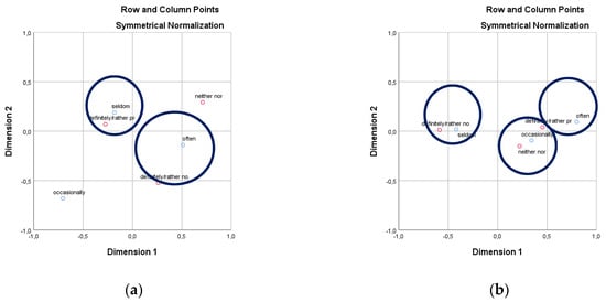 All statistically significant associations are shown in the correspondence map to identify respondents’ behaviour during a pandemic. Figure 5a proves that there is a statistically significant association between the frequency of commuting a week and the consumer’s preference for online shopping during a pandemic. The correspondence map shows that online shopping is the preferred way to shop for employees commuting to work at most once a week. On the other hand, online shopping is not a current way for employees to shop more than twice a week. Figure 5b reveals that hypermarkets as a way of shopping are popular with consumers shopping more than six times a week. On the other hand, hypermarkets are not popular with customers who shop at most once a week.