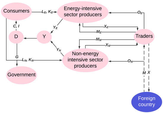 In this section, we describe the general features of the DSGE model used for our analysis. The model was developed in Oyekola [25], which is a streamlined version of that considered by Meenagh et al. [9]. The model assumes that each economy is populated by four agents (consumers, producers, traders, and a government). It is also assumed that the finished goods of the two sectors are imperfect substitutes for similar products being produced abroad. We have assumed for our purpose that all markets are perfectly competitive and that there are no nominal rigidities ([16,17,18]), thereby taking seriously the critique of Chari et al. [26]. Figure 1 gives a visual representation of key macro variables and the interconnectedness between home and foreign countries.