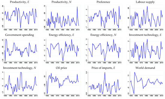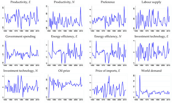 Using the estimated parameters and the indirect inference procedures discussed above, we extract the residuals and shocks of the model; these are depicted in Figure 2 and Figure 3, respectively, with the implied persistence and volatility values for these shock processes reported in Table 2. We observe that all the shocks are mildly persistent, with the highest AR coefficient being that of the world demand shock and the lowest that of productivity shock in the non-energy-intensive sector. It is also observed that world demand, labour supply, energy efficiencies in both sectors, oil price, and preference shocks are the most volatile.