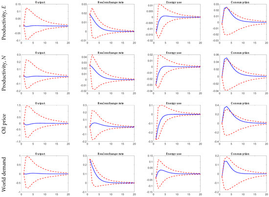 An additional test that we subject our estimated model to is to compare its performance against an empirical benchmark. To do this, we turn next to the VAR impulse response functions of output, real exchange rate, energy use, and consumption to four of the twelve shocks in our model (see Figure 4) (The shocks reported are the two sectoral productivity shocks, oil price shock, and world demand shock. The VAR impulse response functions for the remaining shocks in the paper are shown in Appendix D). We note that the VAR shocks have been identified using the structural model. In the figure, there appears to be congruence in the responses of both the model and the data to all the shocks for output, real exchange rate, and energy use, with their responses placed inside the 95% bounds both in the short and the long term. This is an important result because it provides support for the usability of the model for policy-related work by adapting the structural impulse response functions to determine the influences of shocks and in creating appropriate policy responses ([40]). Nevertheless, we cannot say the same for consumption as there is a consistent short-run difference between the model and the data; this is especially pronounced in the cases of productivity shock in the non-energy-intensive sector and oil price shock (The same is found for the two sectoral energy efficiency shocks and the imported energy intensive goods price shock; see details in Appendix D).