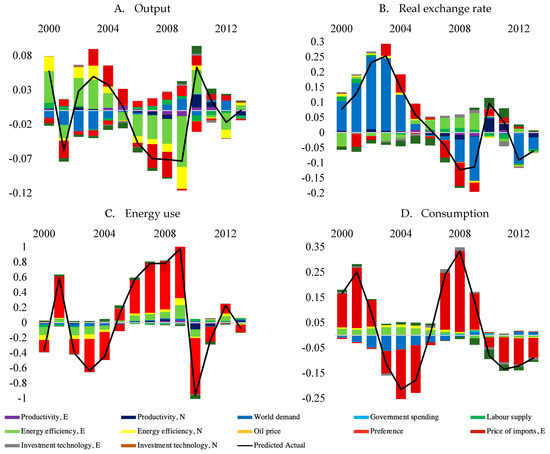 where , and . Consumer price index (CPI) is defined as ; this is also the real exchange rate. The only other price that enters the (solved) log-linearised model is the exogenous world price of imported energy-intensive goods, . and , which are, respectively, the price index of composite goods produced in the home economy and the exogenous world price of non-energy-intensive goods, do not show up in the equations used for model simulation. In an empirical paper on the associations between world shocks, world prices, and business cycles in 138 countries covering the period 1960–2015, Fernández et al. [30] documented that it is important to specify multiple world prices rather than one to elicit the true effects of foreign shocks on the domestic output of a country. Our modelling strategy is thus consistent with their empirical proposition and finding.